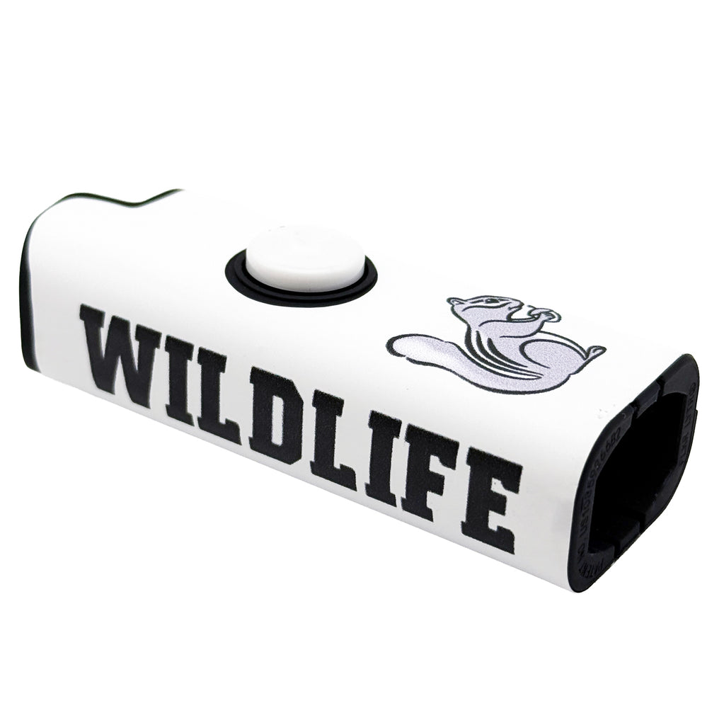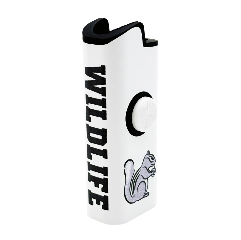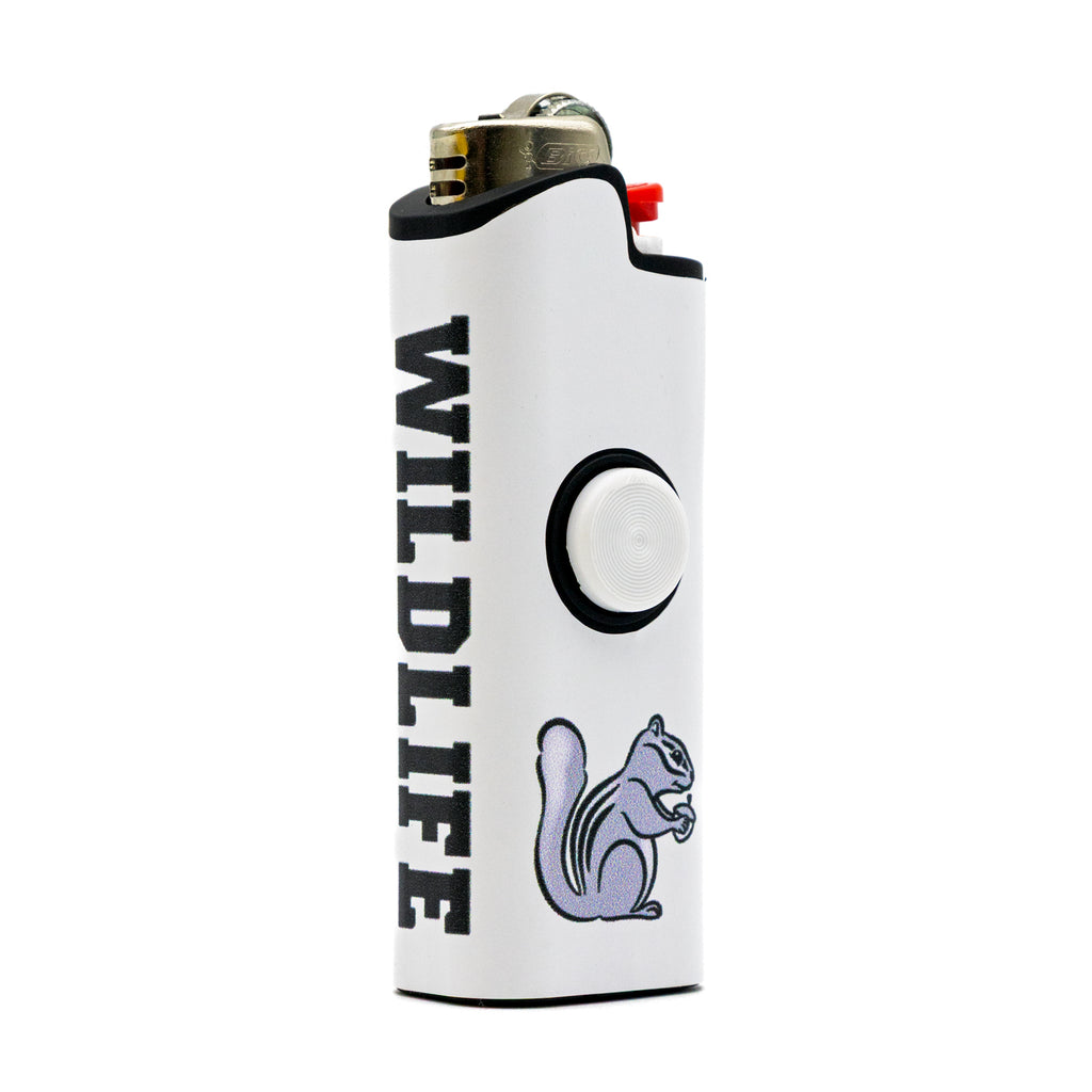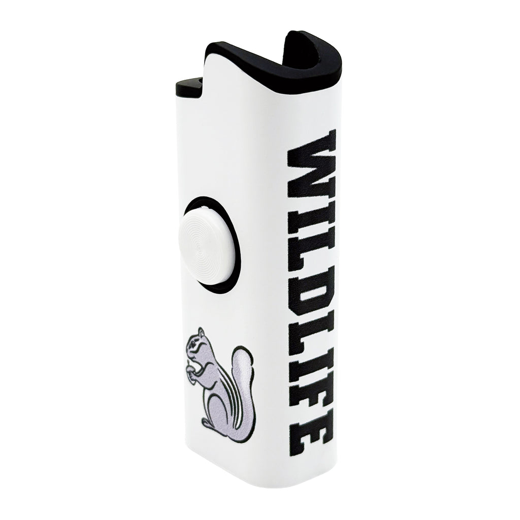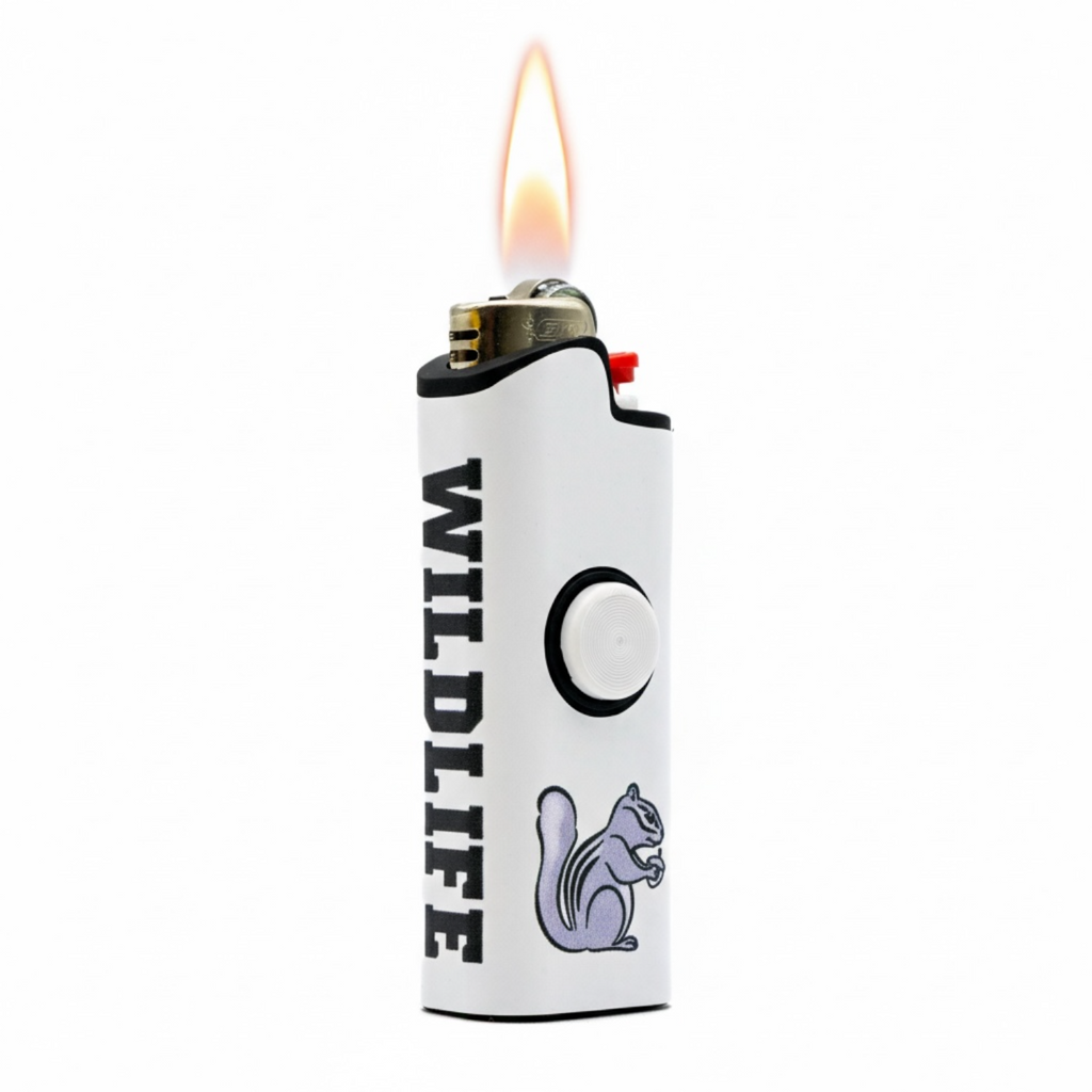 The Wild Life x FLKR LYTR spinning lighter case adds style and movement to your everyday lighter. Designed to fit a standard disposable lighter, this case features a smooth-spinning outer shell for a satisfying, fidget-friendly feel. The clean white body is finished with bold black “WILD LIFE” lettering and a signature squirrel graphic, giving it a standout look from every angle.